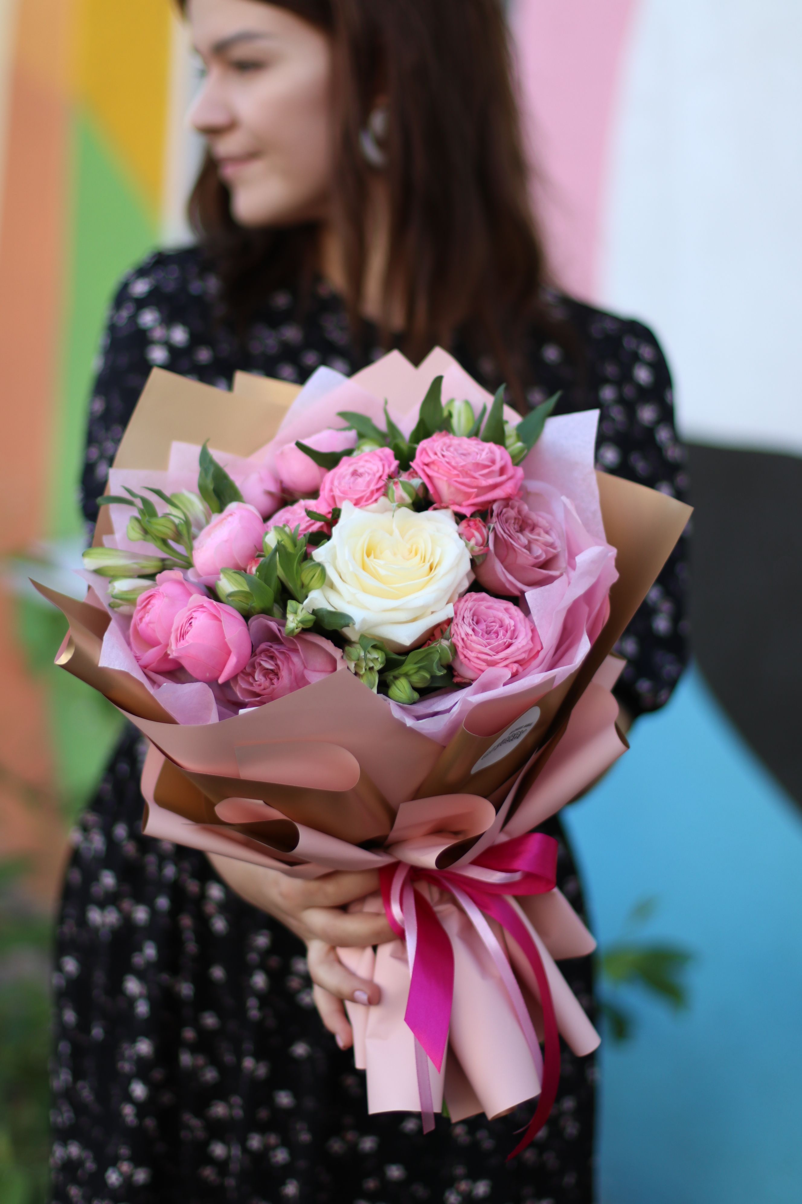 В состав букета вошли кустовые розы сорта МонМартр, пионовидная роза сильвия пинк, садовая охара и альстромерия.