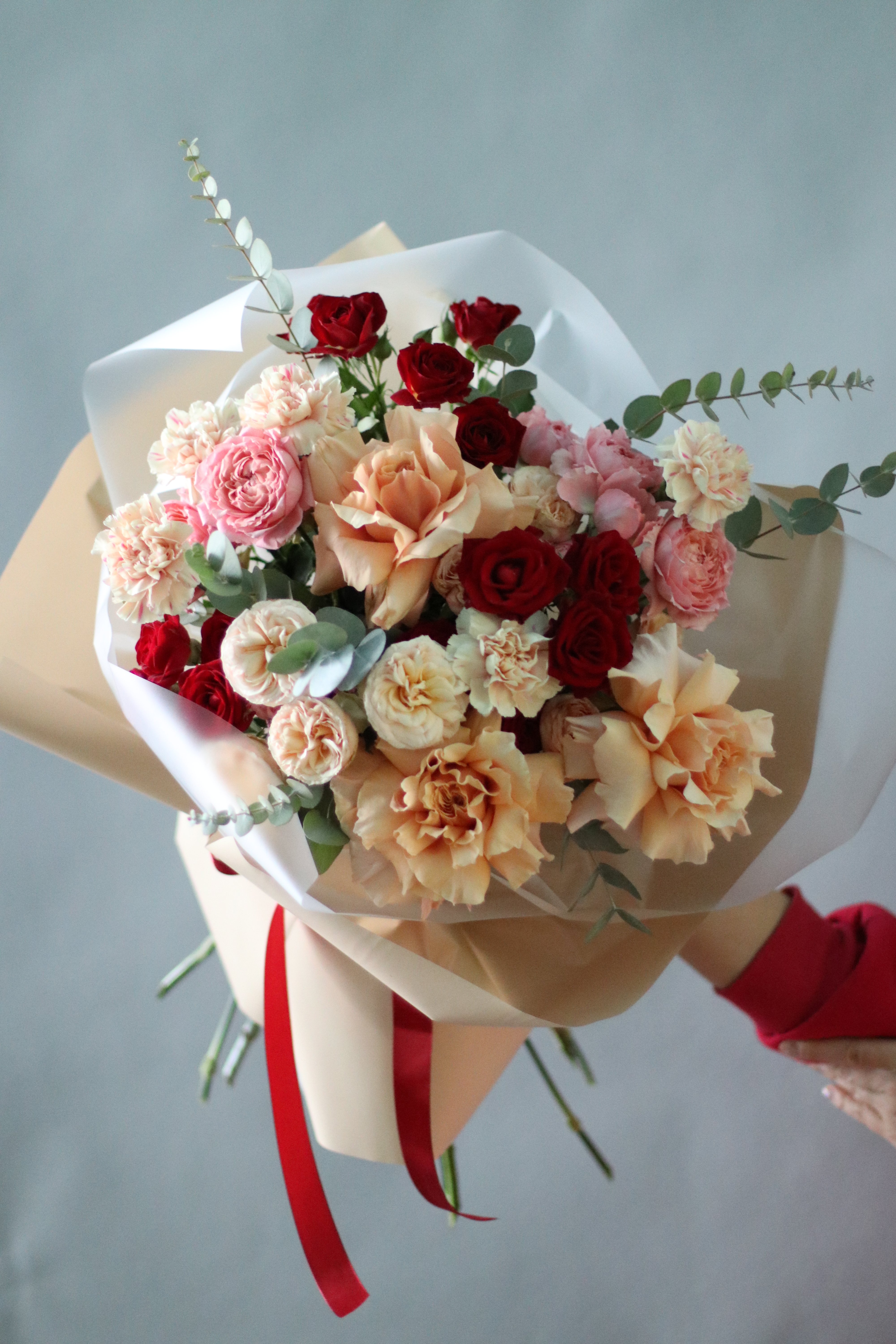 Букет, который запомнится надолго! Наша сливочно-бордовая гамма-роскошные цвета и цветы в одном составе. В состав букета вошли французские розы, кустовые пионовидные розы в бордовом и сливочном оттенке, гвоздики цвета персик, эвкалипт.