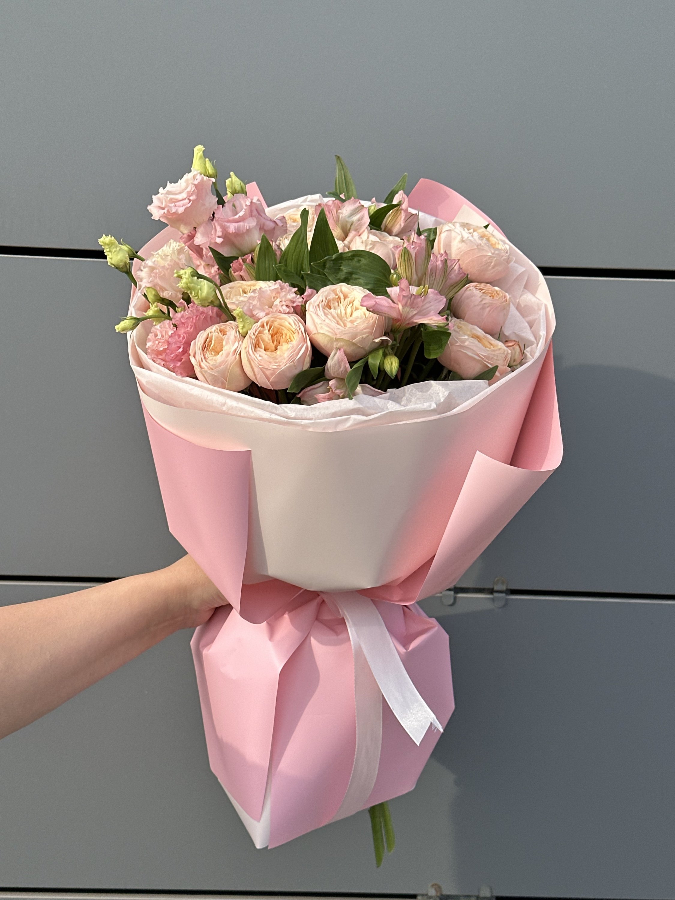 Романтичный и такой изысканный букет от цветочной лавки cactus.by. Пикантные розовые нотки придают особую изящность в сочетании с уже полюбившимися нежнейшими пионовидными розами.