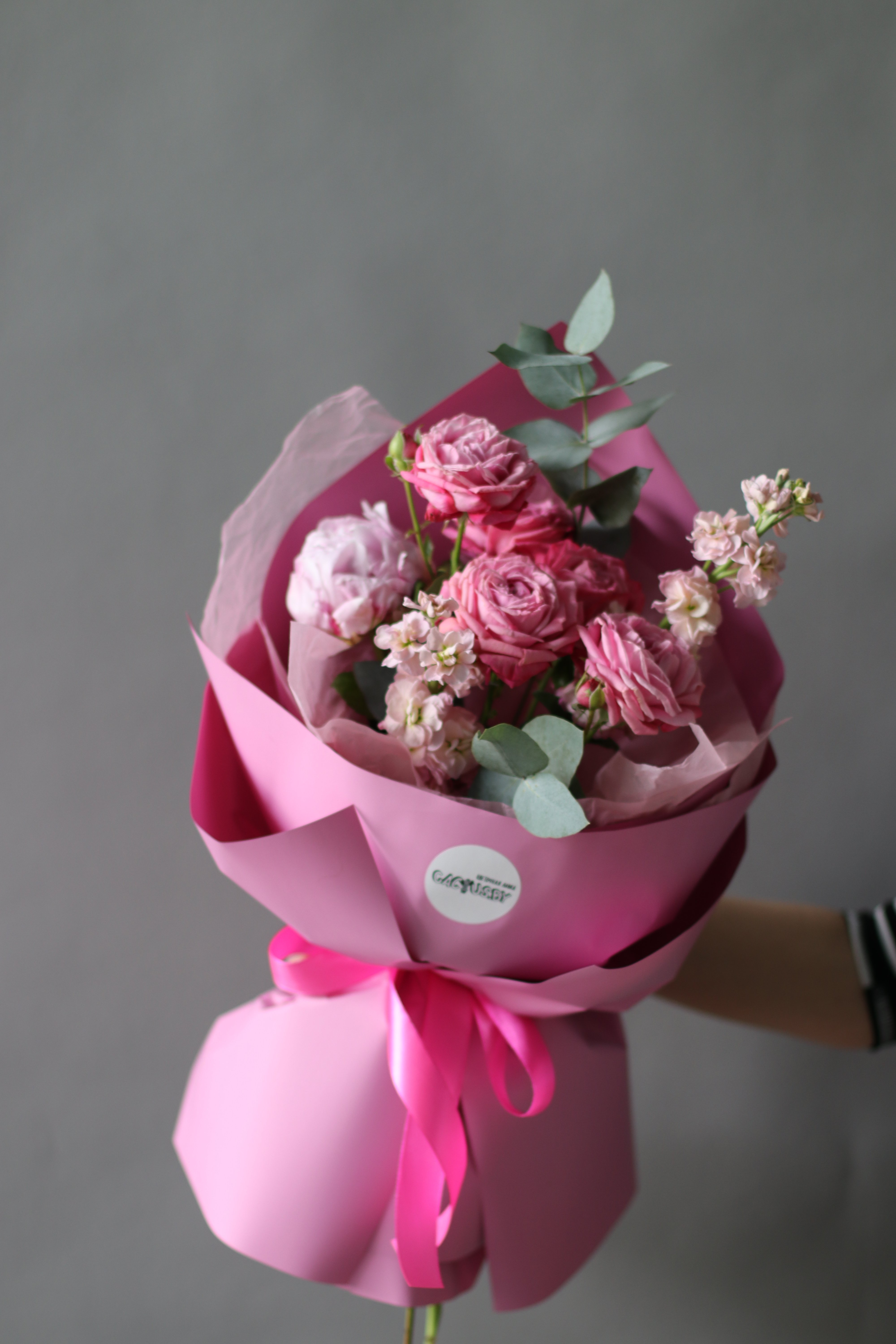 Летние пионовые дни! В состав букета вошли кустовая пионовидная роза, пион, ароматная маттиола и эвкалипт.