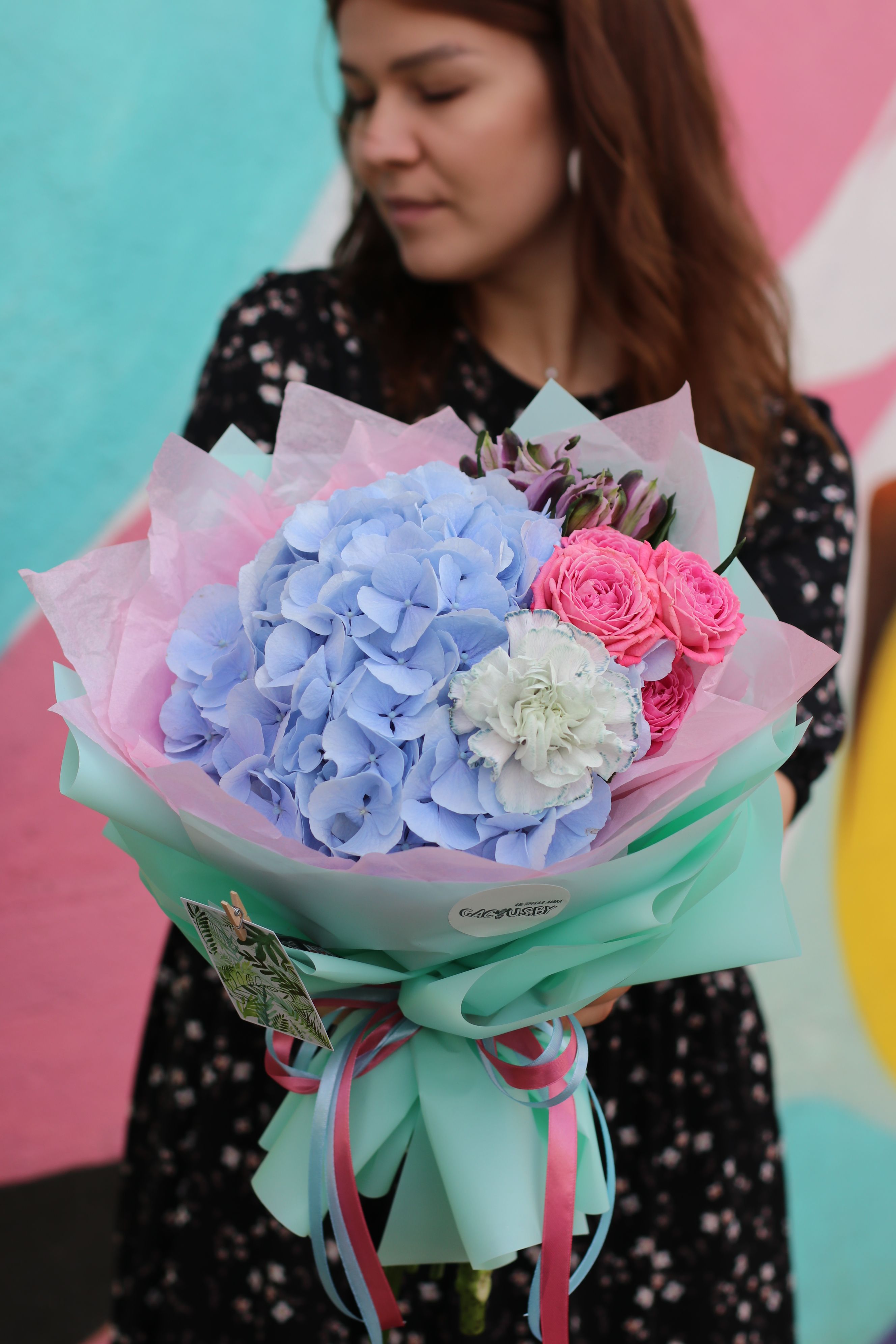 Букет, в состав которого вошли небесно-голубая гортензия, альстромерия, кустовая роза артезия и гвоздика молли.