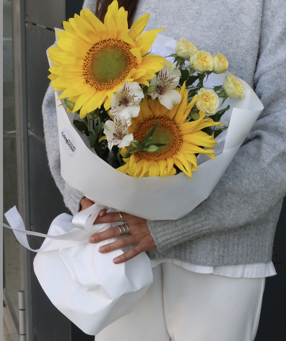Прекрасный букет-комплимент в состав которого вошли альстромери, подсолнухи и желтая кустовая роза.