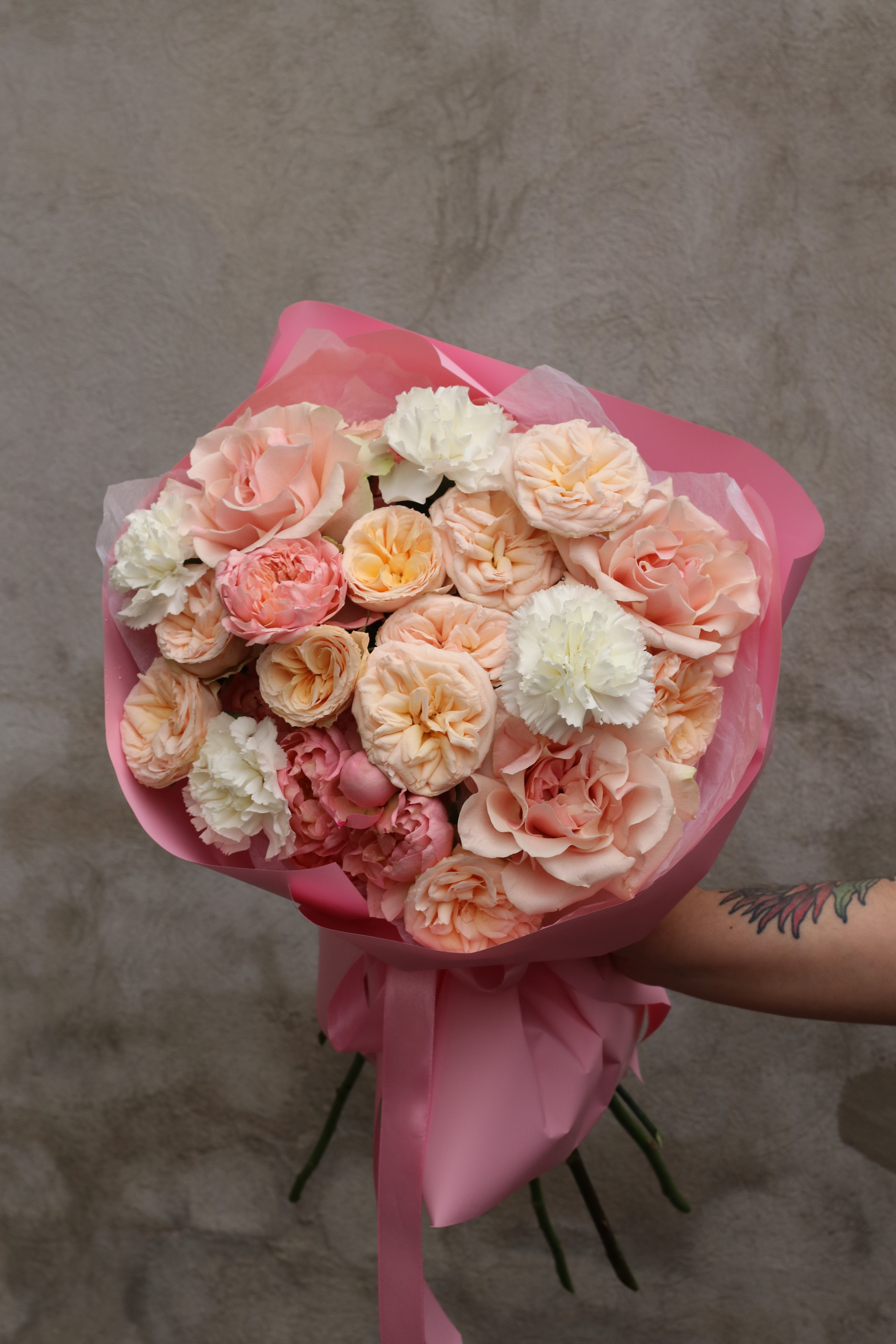Нежные составы наших букетов доставят приятное настроение для вашиш любимых! В состав букета вошли одноголовые французские розы, кустовые пионовидные роз и кружевные гвоздики.