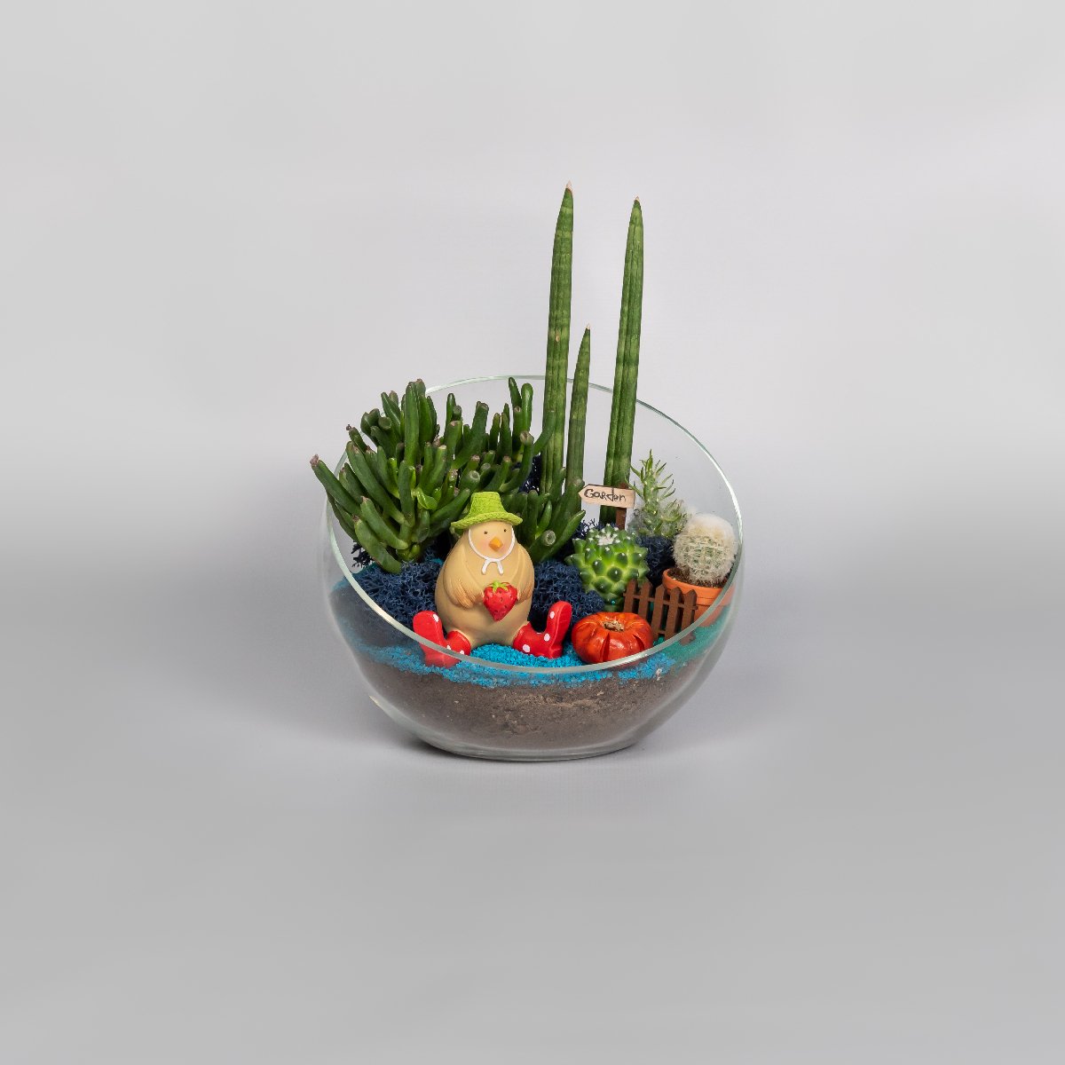 Освещение: Расположите мини-сад под ярким, рассеянным освещением южного или западного окна — прямой свет может обжечь некоторые из растений. В отсутствие таких условий композицию стоит разместить под фитолампой.