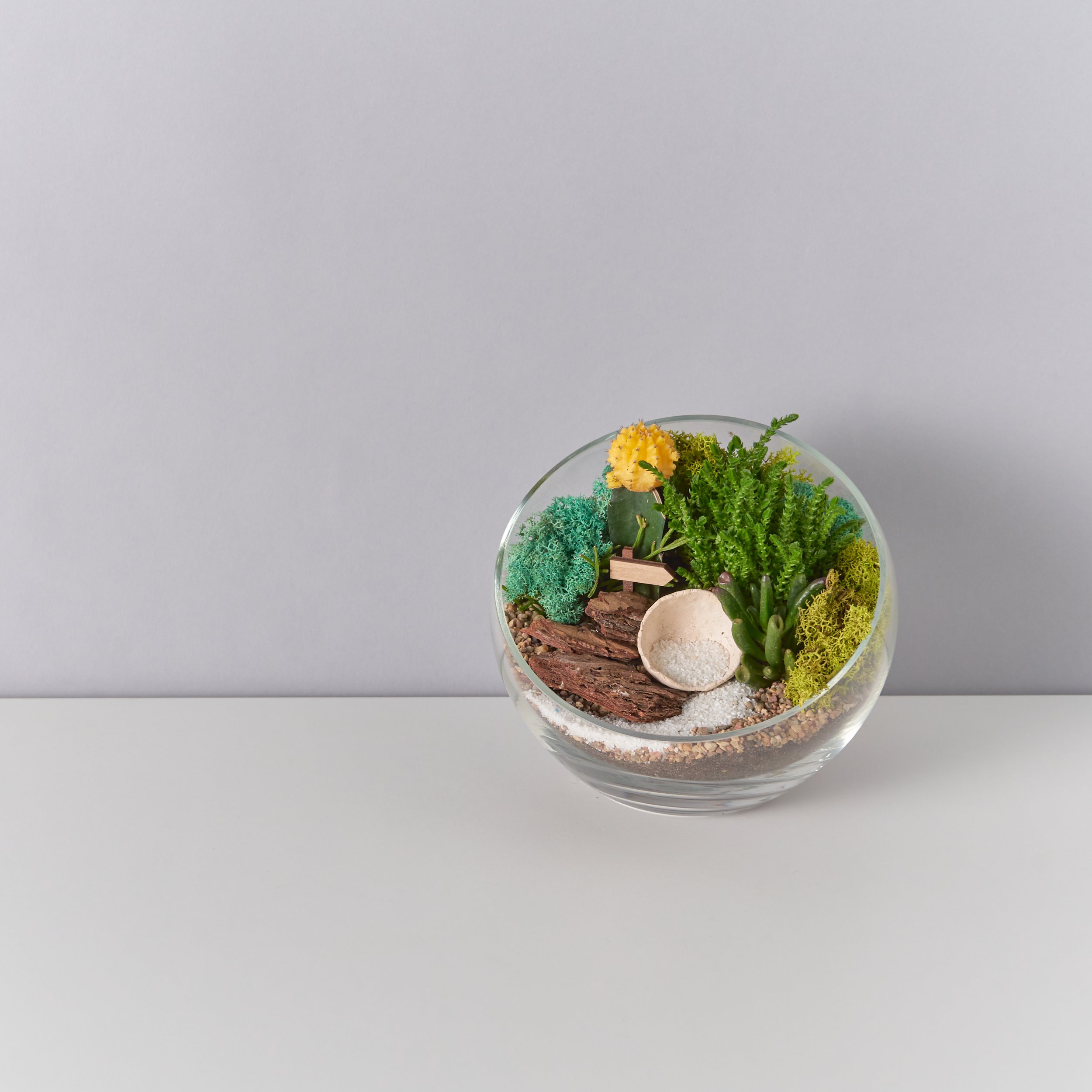Освещение: Расположите мини-сад под ярким, рассеянным освещением южного или западного окна — прямой свет может обжечь некоторые из растений. В отсутствие таких условий композицию стоит разместить под фитолампой.