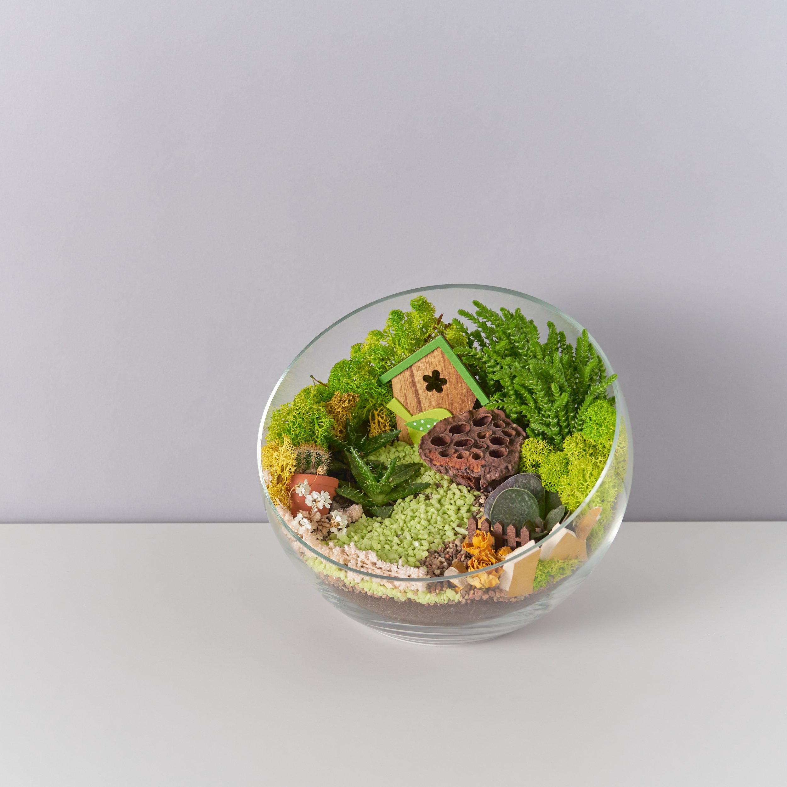 Грунт: Пересаживать растения нужно только тогда, когда они станут слишком большими для мини-сада. Аккуратно извлеките их из флорариума и пересадите в подходящий по размеру горшок, наполненный почвосмесью для суккулентов. Растениям понадобится адаптация к новым условиям роста, поэтому на некоторое время поставьте их на место с рассеянным яркким светом без резких перепадов температуры и не удобряйте.