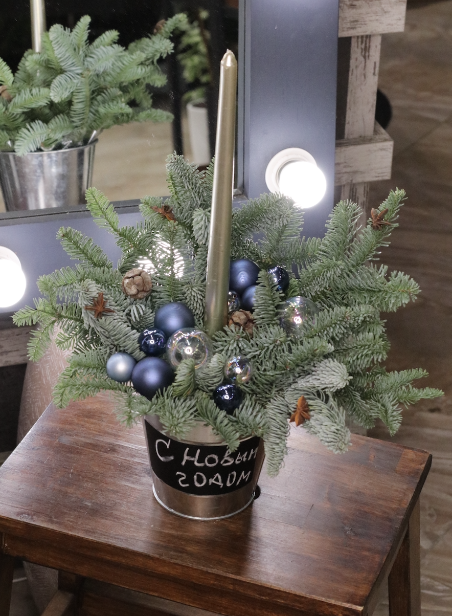 Создаем для вас прекрасные настольные рождественские и новогодние композиции! В состав композиции вошли - кашпо диаметром 12 см, в который весной можно поставить ваше любимое растение, датская пихта-нобилис, стеклянные шары, свеча. Высота композиции около 35 см, диаметр около 25 см.
