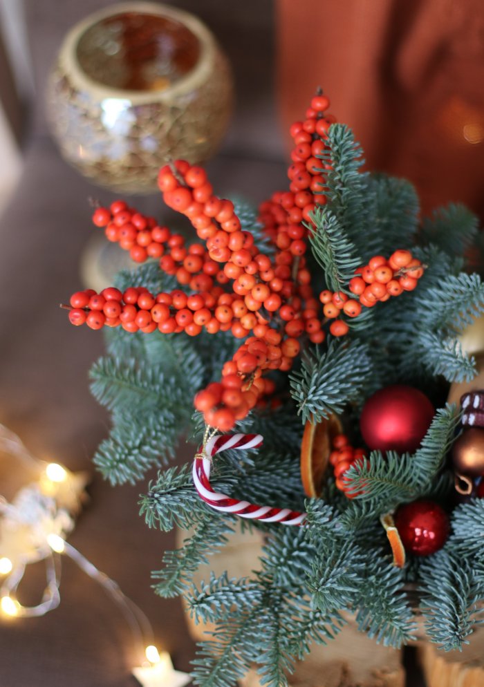 Рождественская композиция в плетеной корзинке. В состав композиции вошли датская ель нобилис (которая не осыпается со временем), ветка илекса, новогодние шары и игрушки.