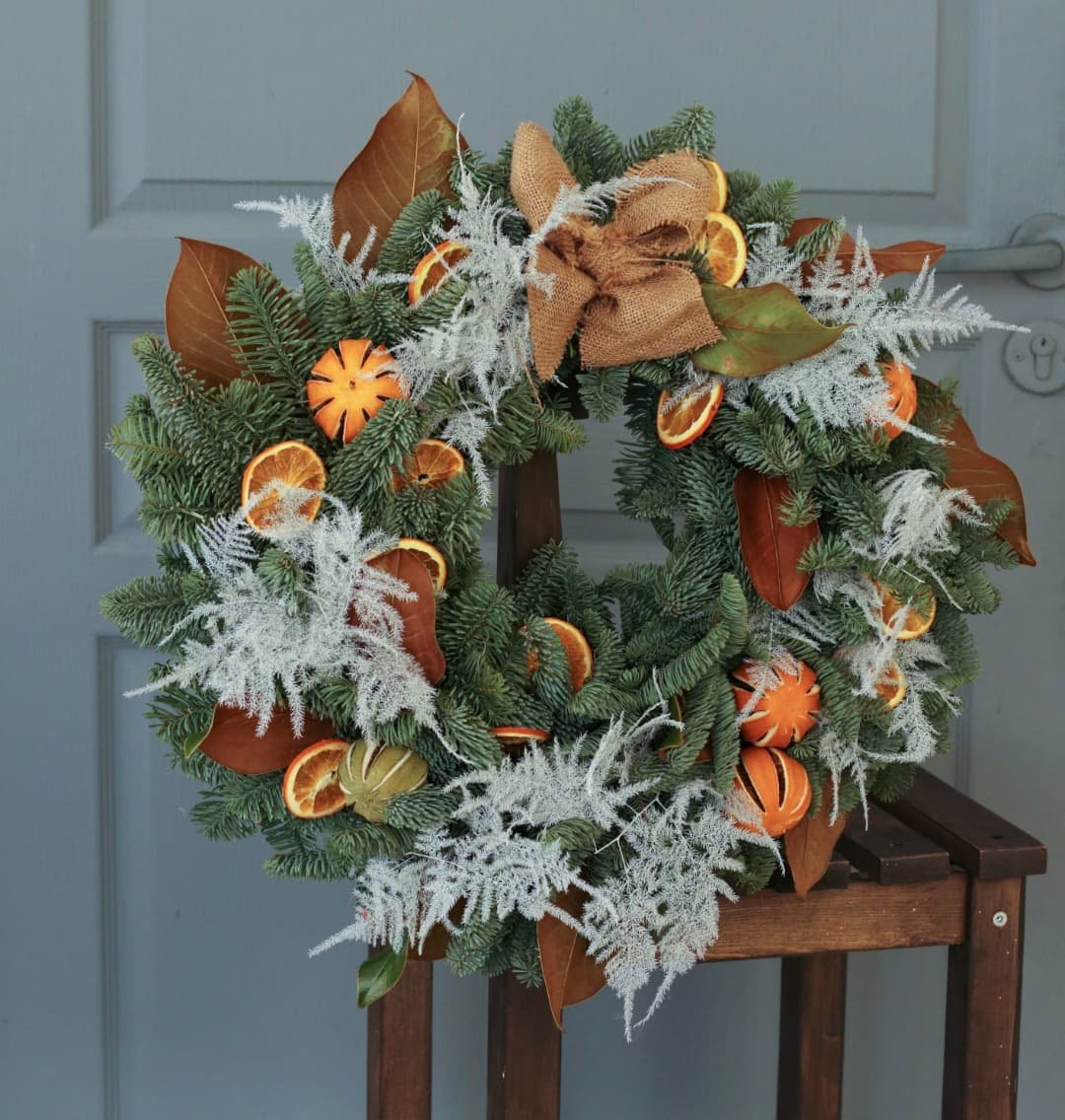 Эко-венок на основе нобилиса, который не осыпается со временем, с добавлением листьев магнолии, аспарагуса, цельных апельсинов, лайма.